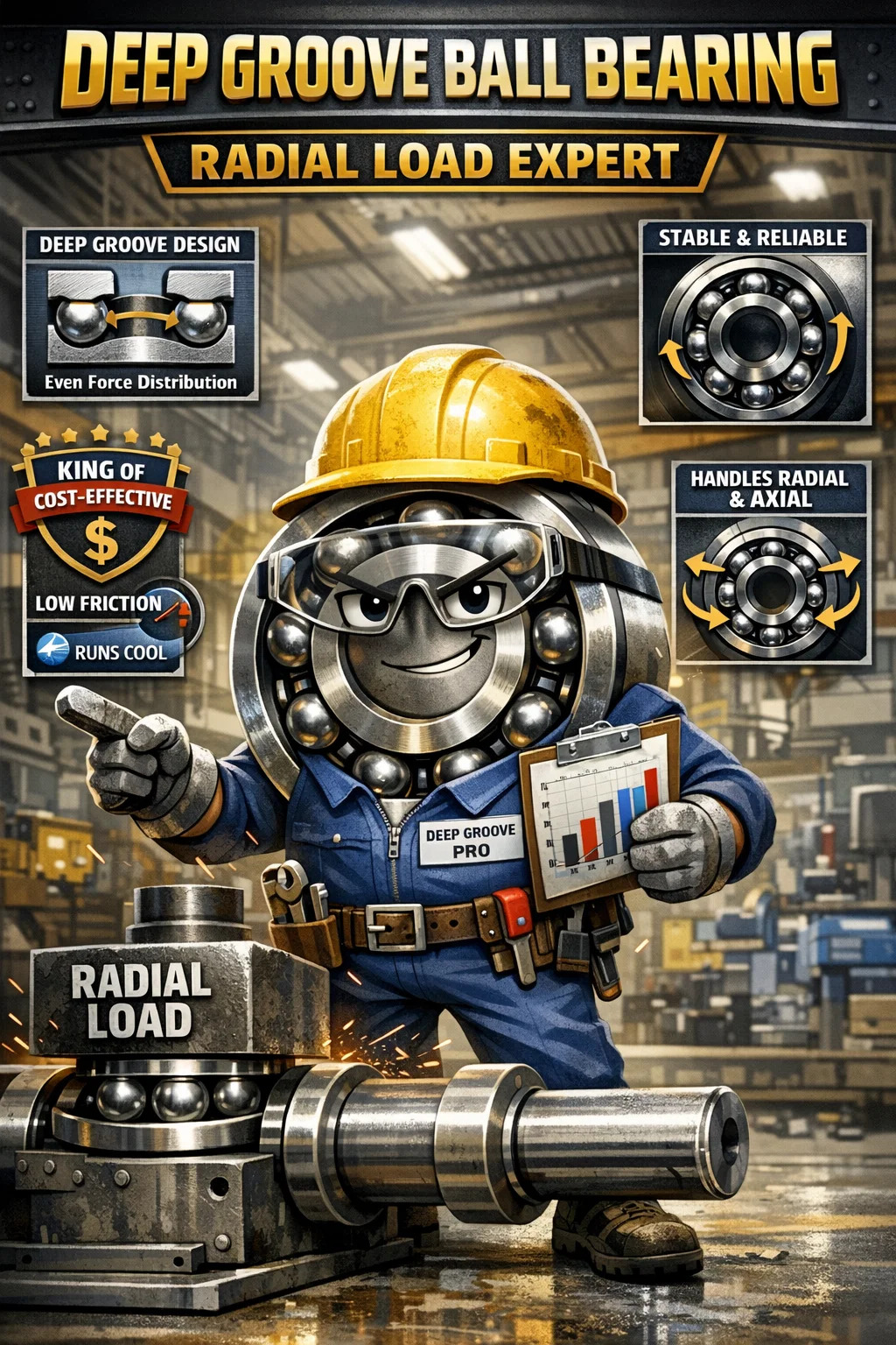 Bantalan bola dalam alur terutama dirancang dan paling cocok untuk menangani beban radial (yaitu, gaya yang tegak lurus terhadap poros, seperti gaya benda berat yang menekan poros).