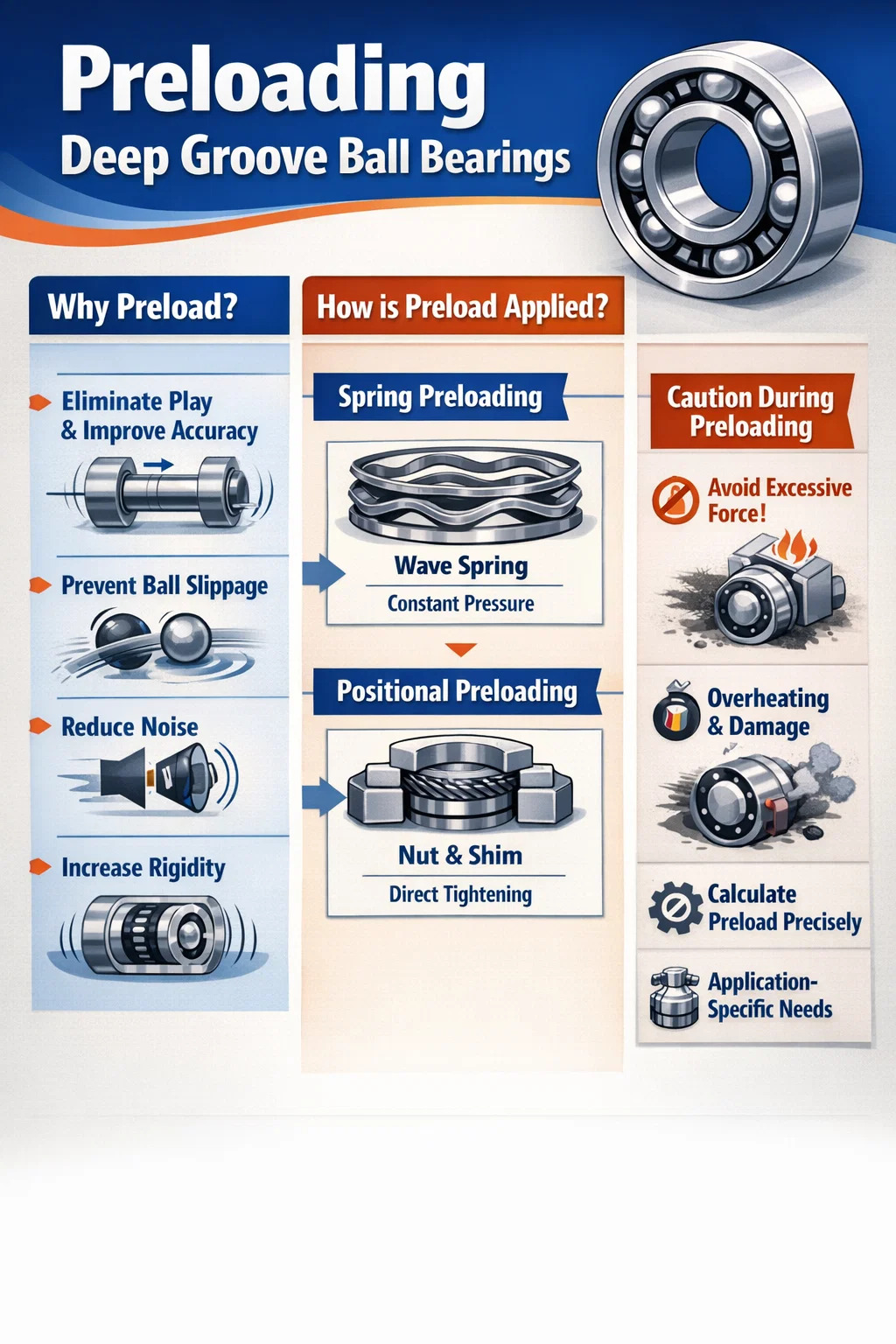 Sederhananya, "pemuatan awal" berarti menerapkan gaya kecil pada bantalan terlebih dahulu, membuat bola baja dan jalur balap lebih terpasang erat, menghilangkan permainan halus (izin) yang seharusnya ada.