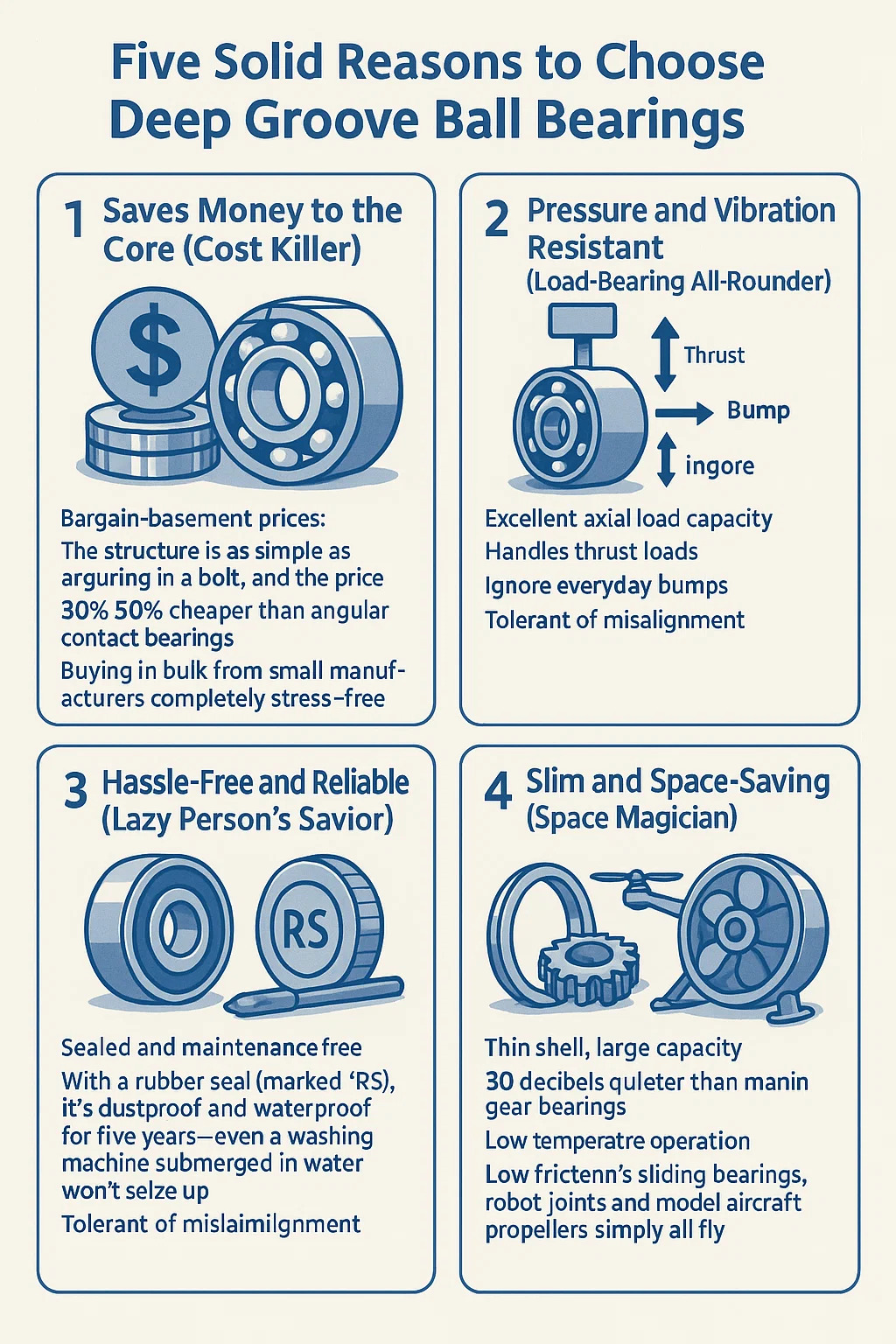 Kapasitas beban aksial yang sangat baik: Rotor motor berat? Conveyor belt membawa barang berat? Tekanan vertikal seperti pijatan.